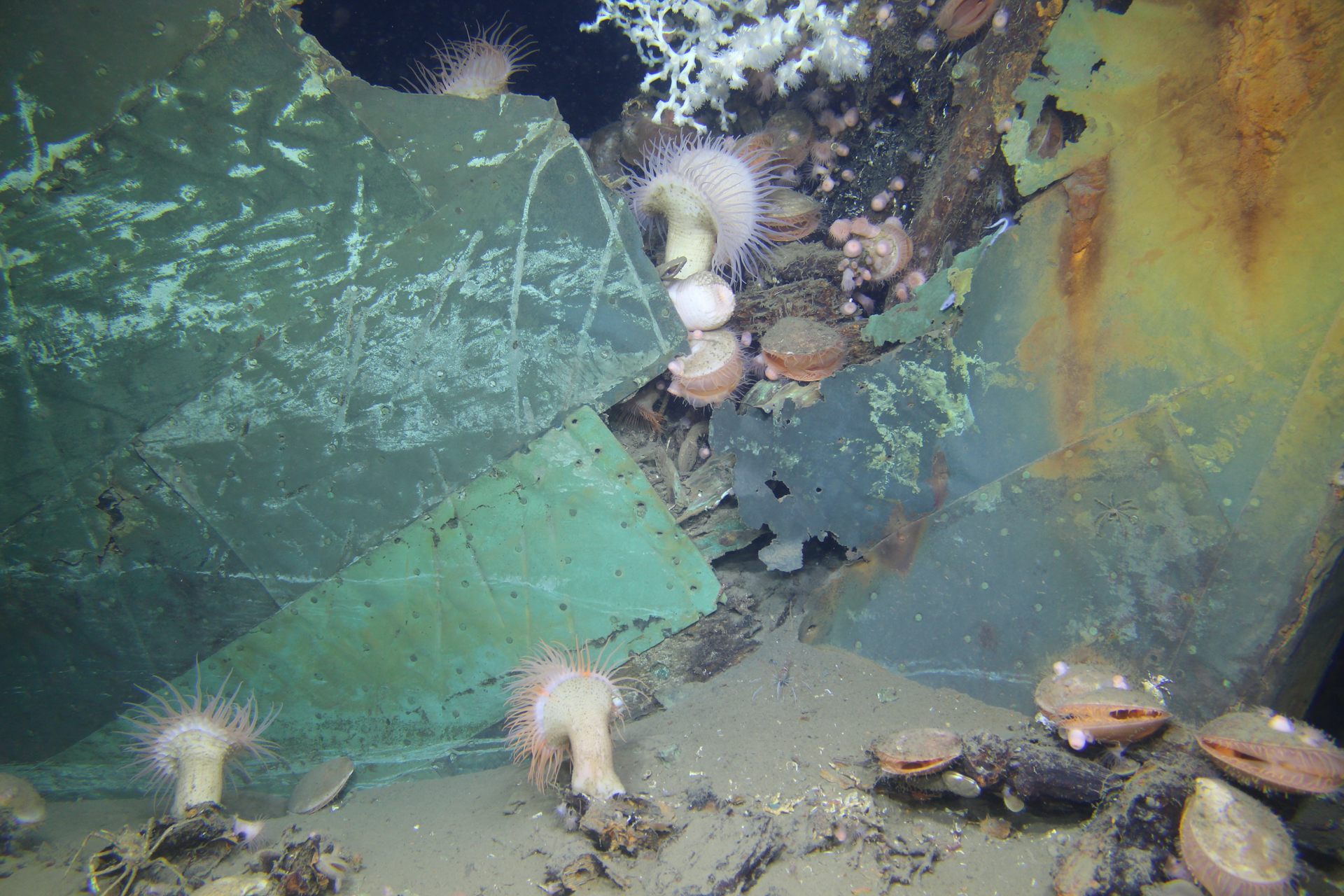Tiny microbes invisible to the naked human eye initially settle on the wreck’s surface, forming a carpet of cells, called a biofilm. This coating helps to make the wreck structure suitable for larval animals like sponges and corals to settle and grow there.